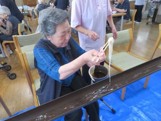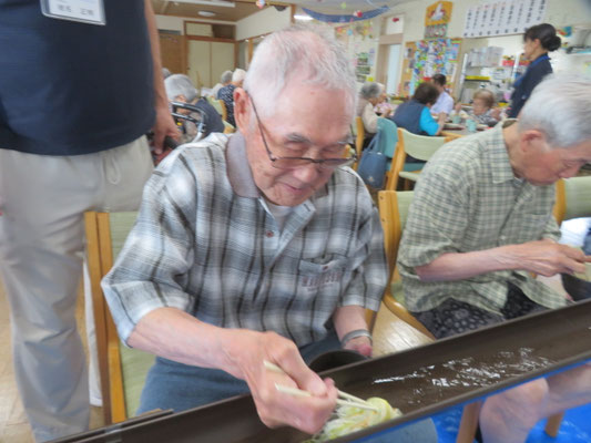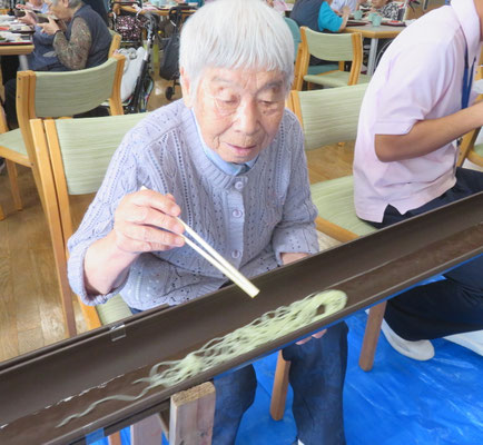 利用者様は、流れてくるそうめんを箸でキャッチしようと真剣な表情で挑戦されていました。 「なかなか取れないね」と笑顔を浮かべながら、何度もチャレンジされる姿が印象的でした。