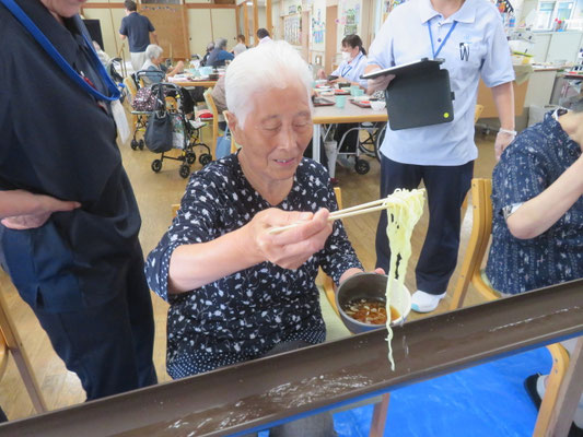 スタッフのサポートを受けながら、そうめんを掴めた瞬間には「取れた!」と喜びの声が上がり、会場全体が和やかな雰囲気に包まれました。 苦戦しながらも楽しそうに参加される利用者様の姿を拝見し、季節を感じていただける貴重な機会となりました。